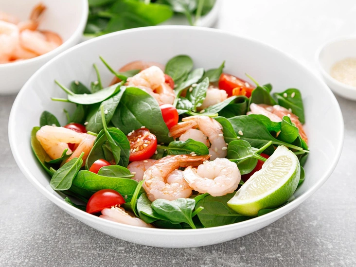 Добавьте шпинат, вареные очищенные креветки, заправьте подготовленной в 1 шаге смесью, если нужно — еще немного посолите. Посыпьте фисташками и подавайте к столу!