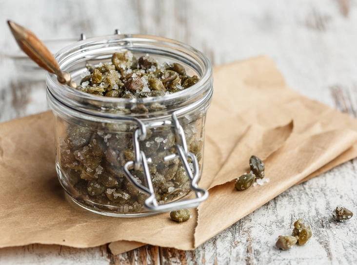 Сможете ли вы сказать, как выглядят каперсы? Каперсы – нераспустившиеся бутоны цветов каперсника, чаще всего соленые или маринованные. Они пользуются популярностью благодаря своему острому, соленому и терпкому вкусу. Считается, что ингредиент повышает чувствительность рецепторов и усиливает вкусовые качества всех составляющих. Поэтому каперсы стараются не подвергать термической обработке и добавлять в самом конце процесса приготовления. В салат вместо них можно положить маринованные огурцы, лучше всего – корнишоны, благодаря которым еда становится более пикантной. Для рыбных или мясных блюд могут подойти зеленые оливки, они придадут остальным ингредиентам схожую остринку.
