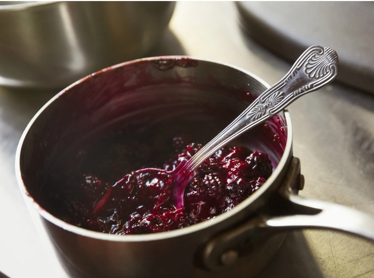 Ягоды ежевики выложить на сковороду, влить вино и добавить сахар, корицу, мускатный орех. Дать потушиться около восьми минут, после снять с огня и процедить через сито, протирая ягоды ложкой.