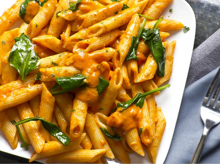 Пасту отварить в кипящей подсоленной воде до состояния al dente. Пока паста готовится, мелко порубить чеснок и отправить его в сковороду с оливковым маслом. Туда же добавить порезанный помидор, соль и перец. Далее одновременно влить в соус водку и сливки, перемешать.