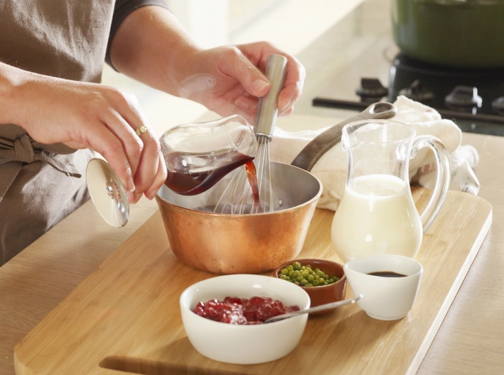 Далее вернуть соус на медленный огонь, добавить воду и тушить еще пять минут. После всыпать в соус муку, хорошо перемешать и добавить сливочное масло. Готовый соус перелить в глубокую емкость и подавать к блюдам из красного мяса или сырам (читайте также: 9 примеров самых удачных сочетаний сыра и вина).