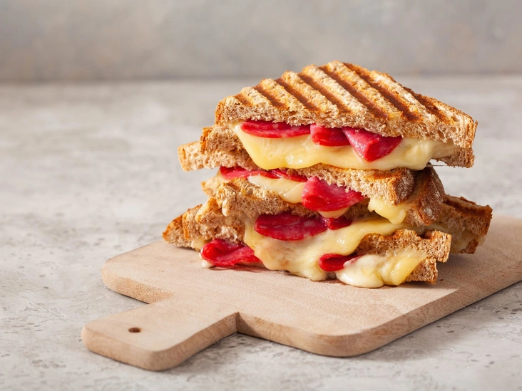 Работая партиями, поместите сэндвичи в предварительно нагретый электрический тостер для сэндвичей и готовьте, пока они не подрумянятся, а сыр не расплавится, около 3 минут.