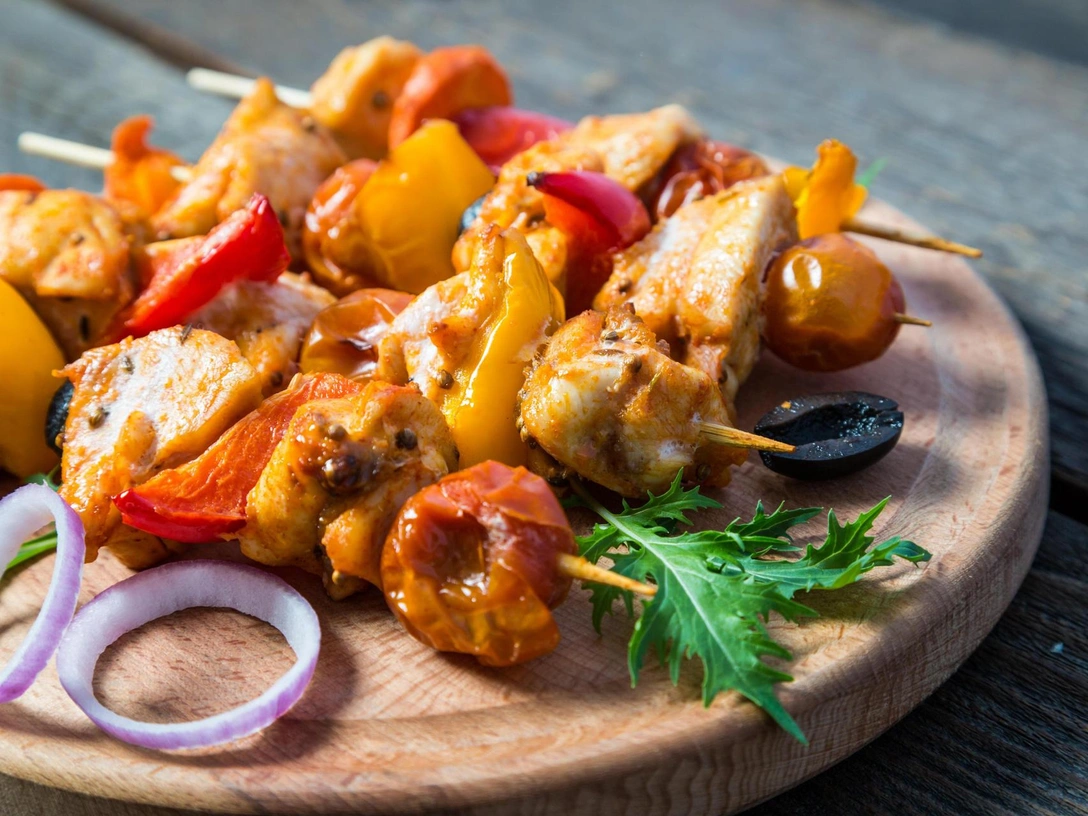 Нарежьте красный перец и нанизывайте на шампуры вместе с курицей. Готовьте 20 минут в духовке или на гриле. Подавайте с рисом и овощами.