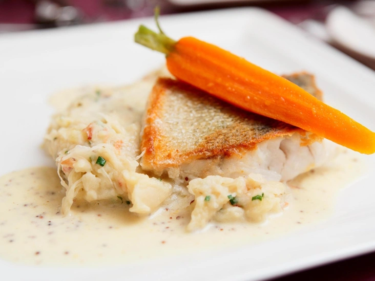 2-3 стакана кислой капусты выжать. 1,5 ложки масла, 1 мелко нарезанную луковицу поджарить, положить капусту, по 3-4 зерна толченого душистого и черного перца, соль, нафаршировать рыбу, зашить, положить на противень, смазанный маслом. Взять 1 стакан. сметаны, смешать с 1-3 желтками и ложкой муки, полить леща, посыпать 2-3 ложками тертого сыра и ложкой сухарей, сбрызнуть жирным бульоном, поставить в печь примерно на 30 минут, поливать стекшим соусом каждые 10 минут. Когда рыба подрумянится, переложить ее осторожно на блюдо. На сковороду же влить 1 стакан. бульона, размешать, вскипятить, вылить на блюдо, не поливая рыбу, голову и хвост украсить пучком зеленой петрушки.