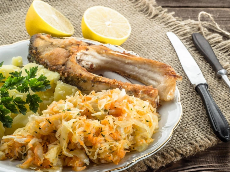 800 г шинкованной капусты промыть, отварить в воде до мягкости. Тем временем очистить около 1,2 кг щуки, отделить мякоть от костей, посыпать ее немного мелкой солью, разрезать на небольшие куски, обвалять в яйце и сухарях или в муке, немного обжарить в 2 ложках масла, обмазать потом форму или глубокое глиняное блюдо маслом, положить слой капусты, несколько кусочков масла, затем натереть немного сыра, положить слой кусочков жареной щуки, полить сверху сметаной, на нее снова положить капусту, масло, сыр, щуку, сметану и так далее. Последним должен быть слой капусты, покрытый кусками масла, тертым сыром и толчеными сухарями. Поставить блюдо на час в духовку.