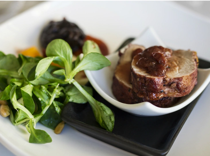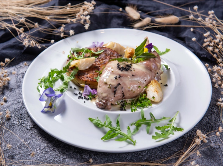 Рулет из кролика со сморчками и сезонными овощами