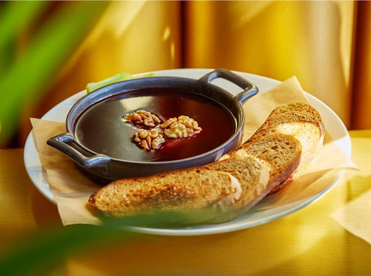 Выпарить портвейн с добавлением сахара. Отдельно замочить желатин в холодной воде на 30 минут. Портвейн и желатин смешать, прогреть на медленном огне, не давая ему закипеть. Затем выложить 2/3 формы паштета, сверху положить грецкий орех. Залить желе из портвейна до краев формы. Охлаждать в течение 8 часов. Подавать с обжаренными гренками и украсить стеблем свежего сельдерея.