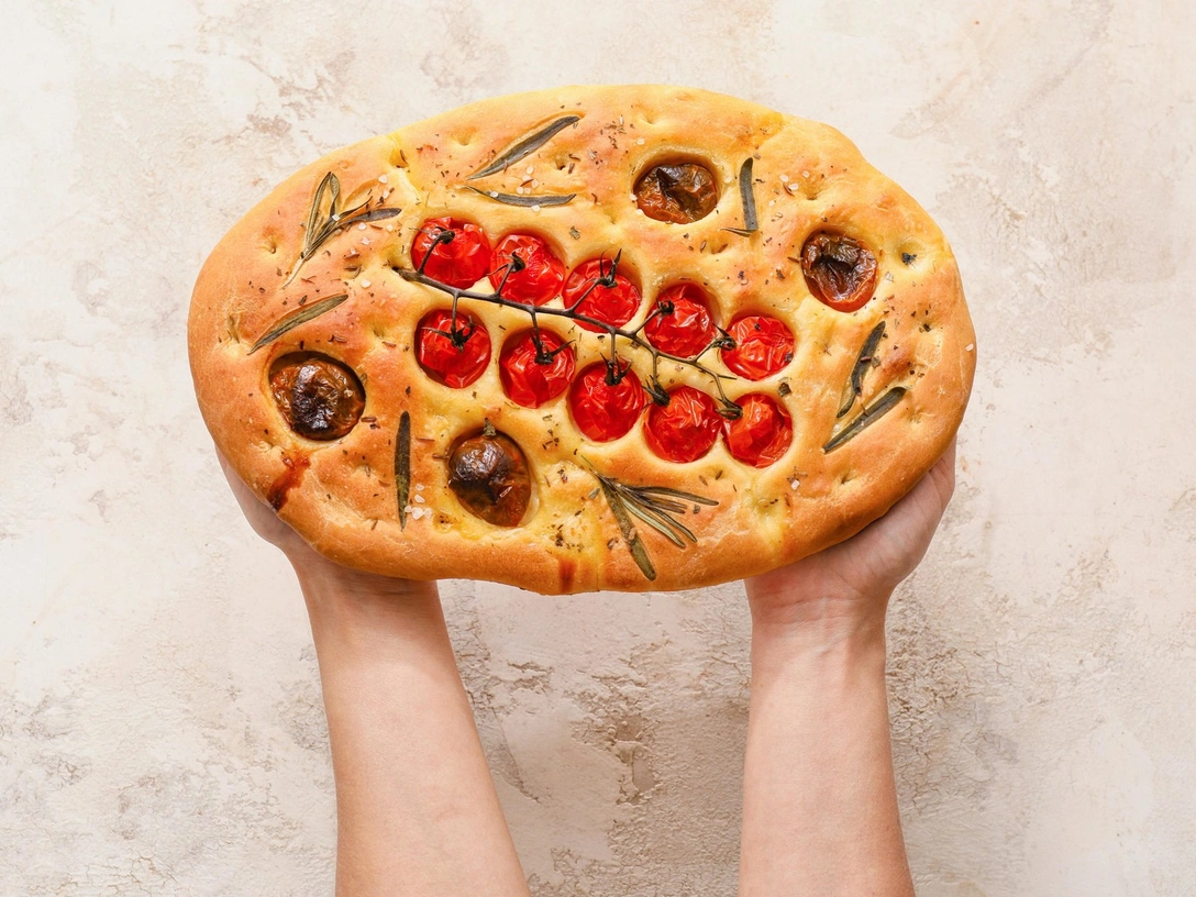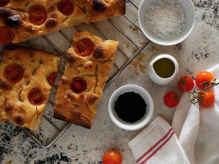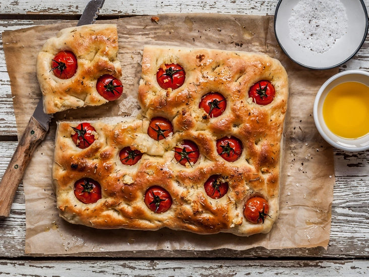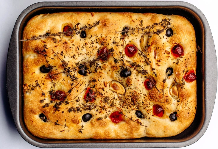 Разогрейте духовку до 160-165 °C. Неплотно накройте фокаччу смазанной жиром полиэтиленовой пленкой и поставьте противень на верхнюю часть духовки для предварительного нагрева на 30-40 минут или пока тесто немного не поднимется над краями формы. Выпекайте в духовке до золотисто-коричневого цвета, около 30 минут. Нарежьте фокаччу на квадраты, дольки или ломтики и подавайте ее с небольшим количеством оливкового масла или бальзамика для макания. Наслаждайтесь домашним хлебом в итальянском стиле в качестве закуски, с салатом или супом. Ее также можно замораживать, так что не беспокойтесь о том, что остатки пропадут.
