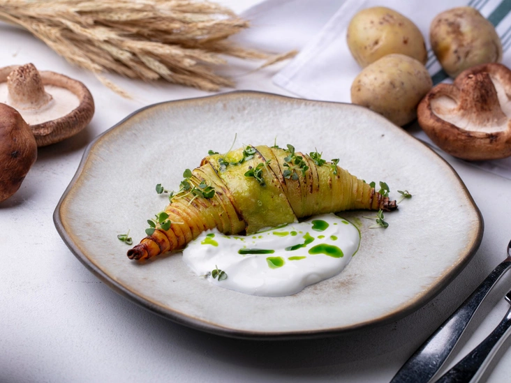 Пожалуй, самое неожиданное на вид и вкус блюдо — картофельный круассан. Его главный секрет в том, что он не содержит теста и глютена, а в качестве начинки здесь любимое с детства сочетание картофельного пюре с тремя видами грибов.