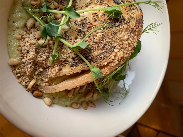В теплую тарелку выложите щедрую порцию кешью-крема, в центр — ломтик запеченной капусты. Если капусту вы приготовили заранее, при подаче прогрейте ее на гриле или на сковороде с небольшим количеством оливковое масла. Посыпьте капусту молотым миндалем и кедровыми орешками, добавьте любимую зелень, немного молотого перца и подавайте.