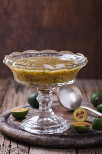 «При дегустации фейхоа покорит вас: сочный, приятный баланс сладкого и кислого, весьма оригинальный аромат с терпеновыми нотками. В джемах он практически полностью исчезает, и фейхоа становится тропическим фруктом вроде банана и маракуйя, в целом восхитительным, особенно с небольшим количеством ванили и лимона» ─ признается в любви фейхоа Ален Карбонно, эксперт по винным сортам винограда. Фейхоа часто едят свежим, но также готовят из плодов джемы, чатни и компоты. Свежие плоды отлично подходят для смузи, их также добавляют в салаты, йогурты, мороженое и алкогольные напитки.