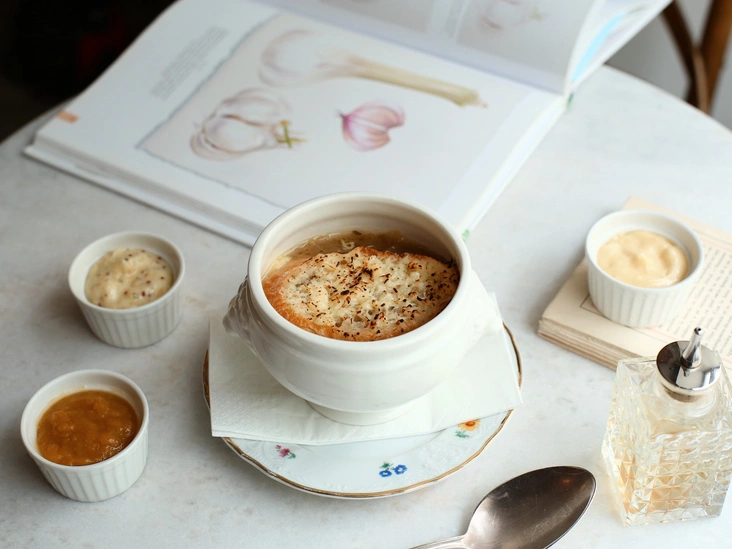 «Французский луковый суп состоит из двух главных компонентов — бульона и лука. Обязательно используется натуральный свежий говяжий бульон и пассерованный лук. Для придания супу особой пикантности в готовое блюдо перед завершением приготовления добавляют розовое вино, усиливая аромат. Сверху кладется кусок свежего багета и сыр (мы используем халуми, что и отличает наш рецепт от классического), а далее суп отправляется в духовку до полного приготовления. Блюдо получается приятно густым и очень насыщенным, а сладкий вкус лука и терпкий аромат тимьяна придают особое послевкусие», — идейный вдохновитель и совладелец кафе «Публика» Юлия Селякова.