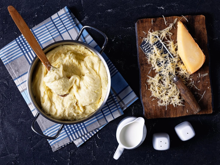 Далее необходимо сделать из вареной картошки пюре (читайте также: Идеальное картофельное пюре: секреты самого вкусного гарнира). Вы можете размять картофель обычной толкушкой или сделать это миксером — следуйте тому рецепту, который вам удобен. Если хотите воспользоваться оригинальным американским рецептом, вмешайте в раздавленный картофель молоко, масло и сметану, перечисленные в списке ингредиентов, а затем добавьте соль и перец по вкусу. Помимо этого, добавьте 1 стакан сыра чеддер.