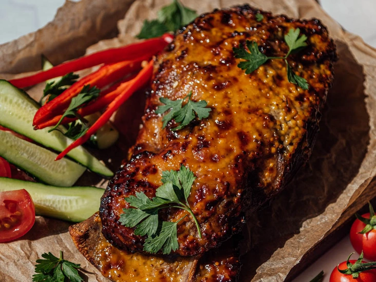 Кастрюлю на 5-7 л наполнить водой и опустить туда подготовленную баранину. Варить на среднем огне (после кипения еще 15 минут). Достать баранину и поместить в заранее подготовленную кастрюлю со льдом и водой (воды и льда должно быть столько, чтобы баранина полностью погрузилась) на 10 минут. С остывшей баранины снять пленку. Выложить мясо на противень и запекать в духовке при температуре 220 градусов в течение 10 минут. Достать мясо и смазать медово-горчичным соусом, поставить в духовку еще на 10 минут.