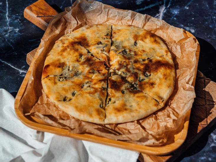 Обжарить репчатый лук до золотистого цвета. Добавить цицмат, шпинат, кинзу, грузинские специи каждого вида по щепотке (читайте также: Гид по специям: самые экзотические, дорогие, полезные). Тушить примерно 5 минут, снять с огня и дать остыть. В остывшую массу добавить орех кешью (мелко резанный) и сыр, всю массу перемешать. Тесто предварительно разморозить, раскатать толщиной примерно 0,5 см.
