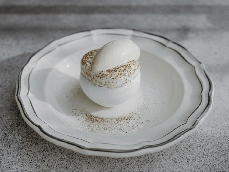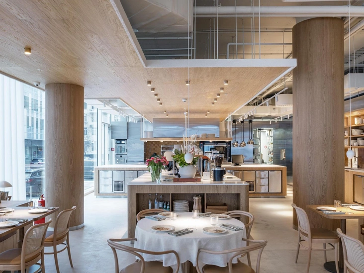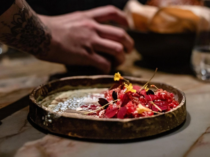 Пропустить чешские фарфоровые тарелки с цветочным узором, фотогеничный картофель с черной икрой и вкуснейший золотой сметанник вы точно не могли — все это то и дело мелькало в лентах социальных сетей. Общий облик пространства довольно уютный, поэтому отлично подойдет для первой встречи. Несмотря на то что помещение небольшое, дизайнерам удалось вместить открытую кухню, столы для пар или небольших компаний и организовать пространство так, чтобы гости сидели не слишком близко друг к другу и чувствовали себя комфортно.