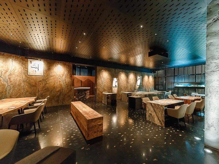 Дизайн заведения был вдохновлен искусством и культурой коренных народов Африки: повсюду этнографические артефакты, текстиль, камни и огонь. В ресторане много посадочных мест: есть зал-саванна, винная комната, два бара и открытая десертная станция. Если заранее забронировать столик не удалось, то сотрудники Maya протянут руку помощи в затруднительной ситуации.