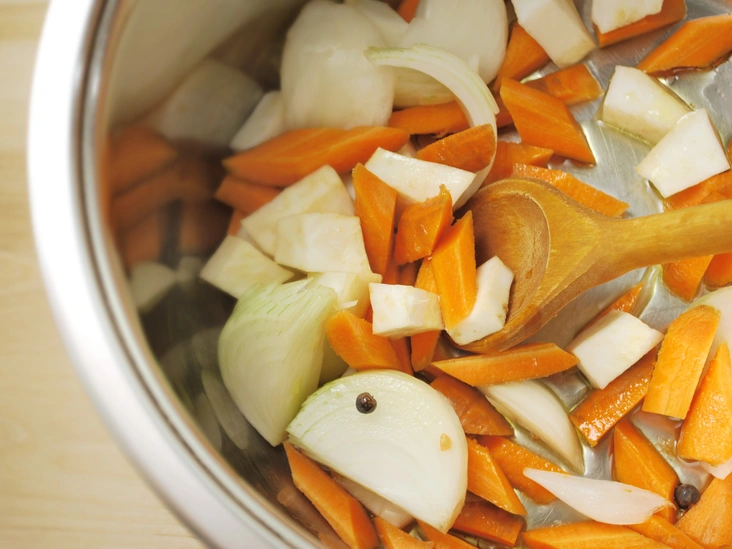 Нагрейте оливковое масло в той же кастрюле на среднем огне. Добавьте в кастрюлю лук, сельдерей и морковь. Приправить солью и перцем. Готовьте, периодически помешивая, пока овощи не начнут размягчаться, около 10 минут. Добавьте чеснок и орегано и готовьте до появления аромата, еще около 1 минуты.