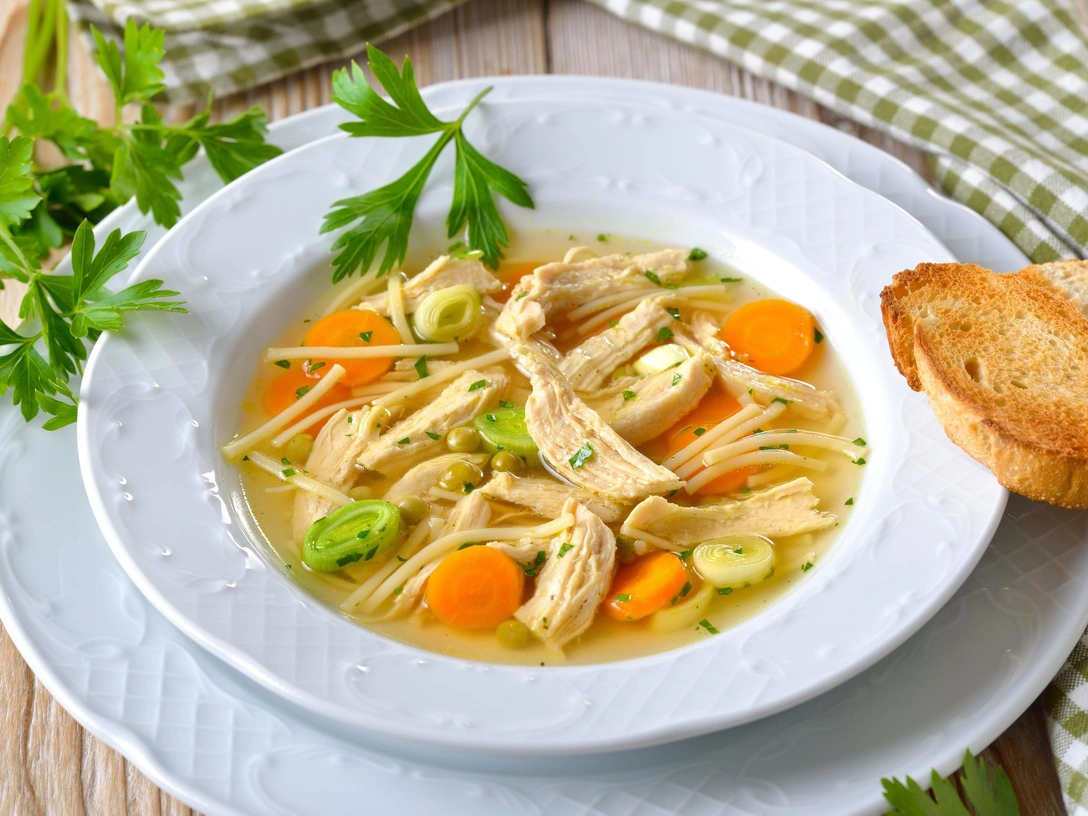 Пожалуй, сложно придумать более универсальное блюдо, чем легкий куриный суп с лапшой. Используйте курицу, морковь, лук, чеснок, сельдерей и вермишель, а также петрушку и орегано, чтобы приготовить полезную и питательную пищу для всей семьи. Некоторые хозяйки намеренно измельчают более длинные спагетти до размеров вермишели, чтобы добиться нежности консистенции и ностальгического оттенка блюда. Вы можете иметь этот прием в виду, если не держите дома мелкую вермишель. Ну а если вам надоели привычные супы, используйте рецепт в азиатском стиле (читайте также: Куриный суп по-новому: всего два ингредиента, которые изменят привычное блюдо к лучшему).