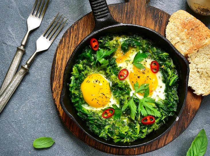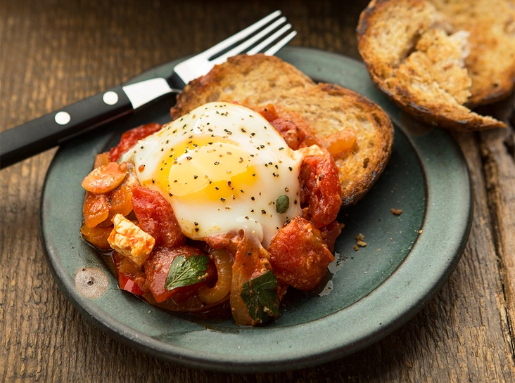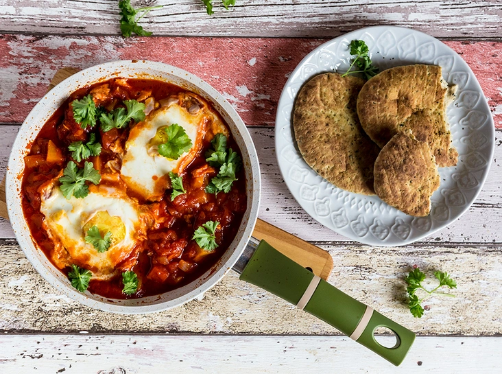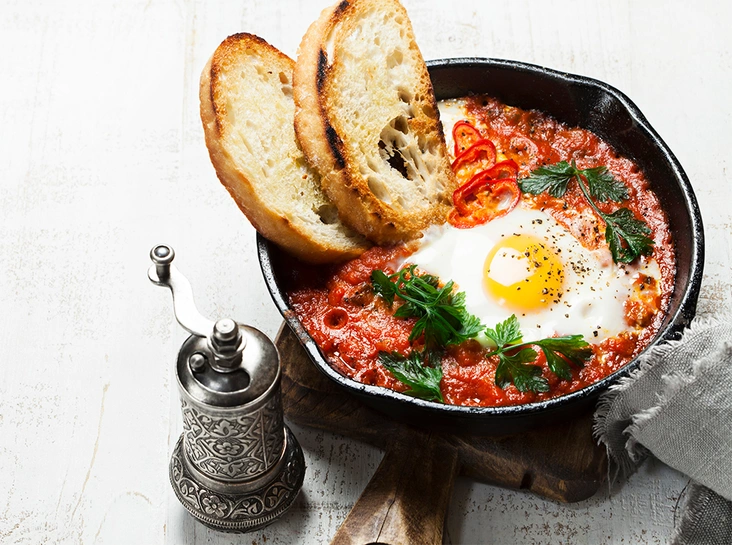 Подается традиционная шакшука всегда с горячим хлебом и салатом из свежих овощей. И то и другое вполне можно организовать дома (тостер и овощерезки вам в помощь). А если лень, то подойдет кусок просто свежего белого хлеба и пара огурцов/помидоров. И уж совсем необязательно сервировать блюдо так, как это делают на востоке — на порционной раскалённой сковородке, хотя, согласитесь, в этом есть некоторый колорит.