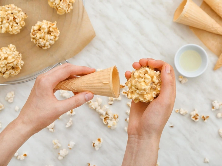 В большой кастрюле растопите сливочное масло. Добавьте цветной зефир (лучше всего выбирать нежные пастельные оттенки в праздничном ключе) и постоянно помешивайте, пока он не растает и не станет напоминать расплавленную смесь. Вылейте растопленный зефир на попкорн и перемешайте, чтобы он покрыл весь попкорн. Сбрызните руки кулинарным спреем или натрите маслом и зачерпните немного попкорна и начните аккуратно формировать шарики. Ни в коем случае не сжимайте и не уплотняйте попкорн слишком сильно, иначе он начнет крошиться и потеряет изначальную консистенцию.