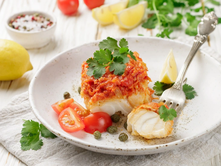 Филе трески подготовить (разморозить, промыть и обсушить), обвалять в муке, посолить и пожарить на растительном масле. Готовую рыбу выложить на тарелку, а сверху — готовую овощную смесь. При желании блюдо можно посыпать свежей зеленью.