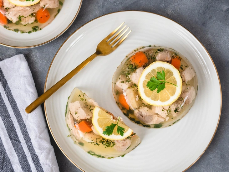 В блюдо влить первый слой бульона (около 5 мм), отправить в холодильник до застывания. Затем готовое филе нарезать на кусочки и выложить поверх застывшего желе, полить каждый кусочек небольшим количеством бульона и вновь убрать в холодильник. Затем залить блюдо оставшимся количеством желе (перед этим также можно добавить украшения по вкусу — перепелиные яйца, отварную морковь) и еще раз поставить в холодильник до полного застывания.