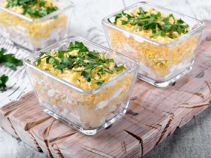 Яйца отварить вкрутую, очистить и разделить белки и желтки. Белки измельчить ножом, желтки — вилкой. Лук и зелень мелко порубить, сыр натереть на мелкой терке, удалить кости из консервов и измельчить их вилкой. Далее слоями выложить салат: сначала белки, затем слой сыра, консервы, майонез, зелень, половина желтков, снова майонез и зелень. После натереть замороженное сливочное масло и выложить оставшиеся желтки.