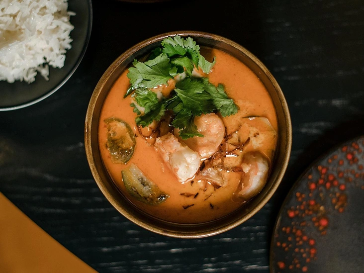 Для подачи нужно подготовить и остальные ингредиенты. В сотейник налейте 150 г базы, добавьте тонко нарезанную куриную грудку, нарезанные грибы цаогу, томаты черри, заранее отварные мини баклажаны, рубленный перец чили, а также очищенные тигровые креветки. Доведите до кипения, а после смешайте с кокосовым молоком и доведите до вкуса специями.