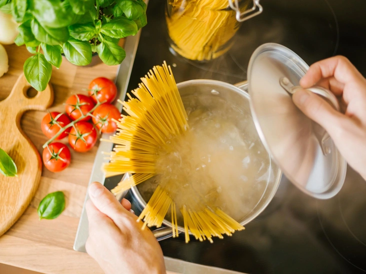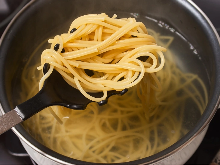 Налейте в нее воду любой температуры (на 100 гр макаронных изделий должен быть 1 литр воды);