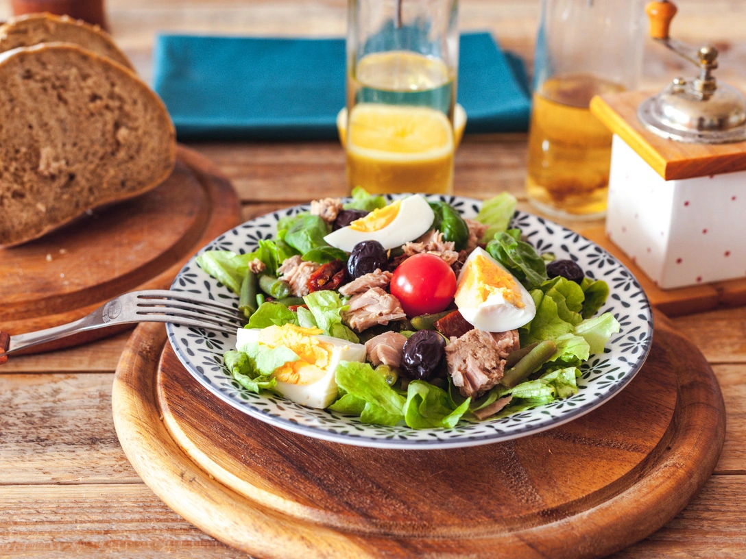 Куски салатных листков выложите на дно тарелки или глубокого салатника (зависит от сервировки ─ общей или индивидуальной), сверху ─ нарезанные овощи, яйца и кусочки тунца. Заправьте салат соусом, украсьте оливками без косточек и подавайте к столу.