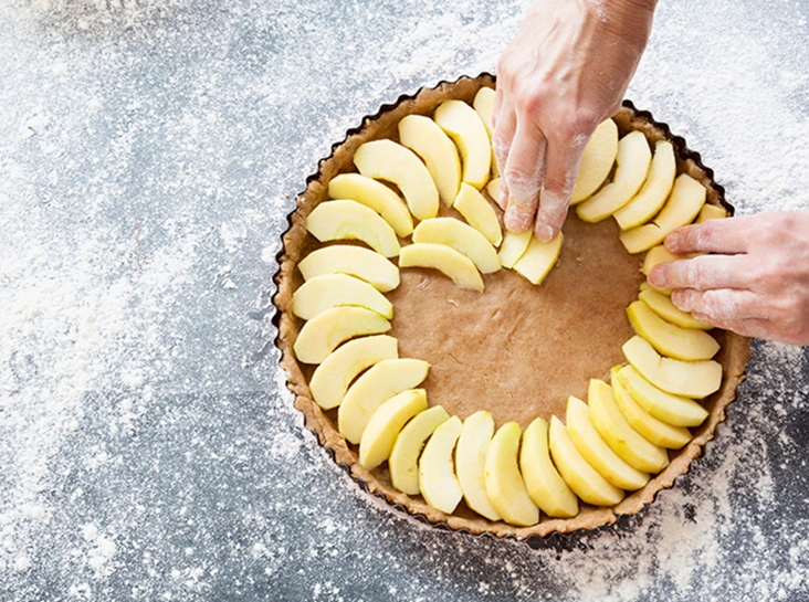 Для теста лучше использовать разъёмную форму, чтобы у нашего пирога получились бортики: выложите его на смазанную сливочным маслом, сверху аккуратно разложите яблоки и залейте сметанным кремом.