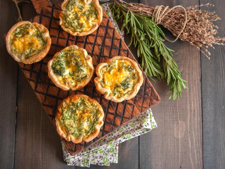 Смешайте молоко и оставшиеся ингредиенты, перемешайте венчиком до однородности. Вмешайте сырную смесь. Равномерно распределите смесь по подготовленным формочкам для маффинов. Выпекайте при температуре 175 °C в течение 20 минут или пока мини-киши не поднимутся и не затвердеют (учтите, что они будут немного сдуваться по мере остывания.) Подавайте киши теплыми.
