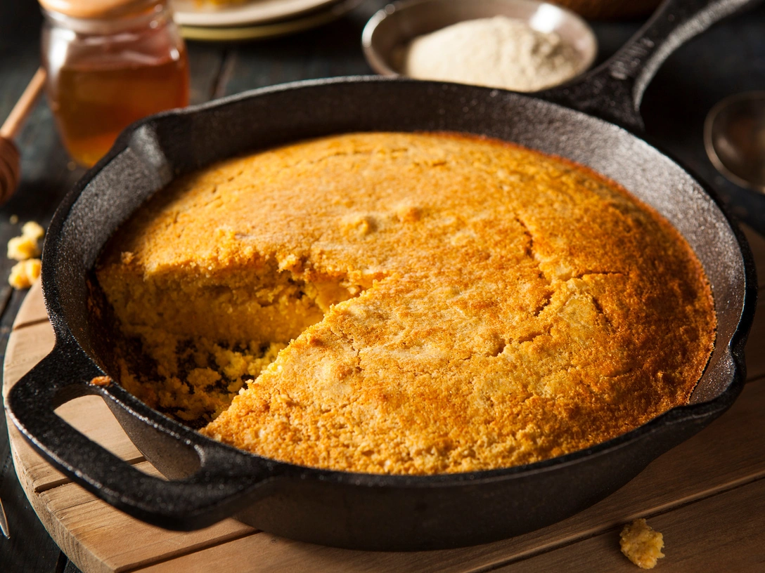 Для начала необходимо разогреть духовой шкаф до 210 градусов. Далее растительное масло налить в глубокую жаропрочную емкость и отправить его греться. В миске смешать кукурузную и пшеничную муку, разрыхлитель, пищевую соду, сахар и соль, тщательно перемешать, затем добавить куриное яйцо и пахту. Далее вытащить емкость с маслом из духовки, влить горячее масло в миску с остальными ингредиентами и замесить тесто (по консистенции оно не должно быть слишком жидким). Перелить готовую массу в емкость, где ранее грелось масло, и отправить выпекаться примерно на 10 минут при температуре 210 градусов до золотистой корочки — готовность хлеба можно проверить деревянной шпажкой (читайте также: 5 кухонных секретов, о которых вы могли не знать (или сомневались в их правдивости)).