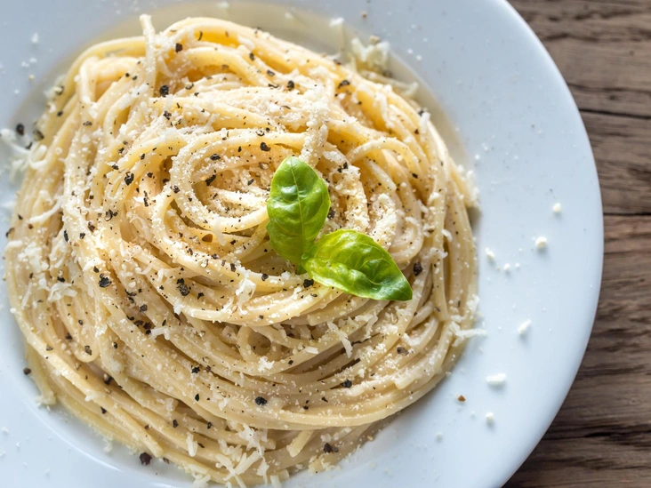 Добавьте макароны в сковороду, перемешайте, добавьте половину пармезана, перемешайте снова. Затем добавьте половник воды от макарон, остаток пармезана и нарезанную петрушку. Перемешайте и подавайте к столу.