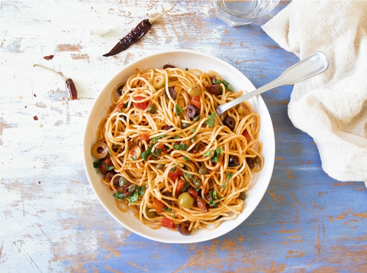 Отарить спагетти согласно инструкции. Чеснок мелко порубить и отправить в сковороду с оливковым маслом. Туда же добавить помидоры, каперсы, молотый перец и нарезанные анчоусы и маслины — тушить соус около шести минут на среднем огне. Солить соус следует в самом конце, но делать это необходимо аккуратно — ингредиенты для блюда содержат в себе много соли (читайте также: Все, что вы хотели знать о пищевой соли).