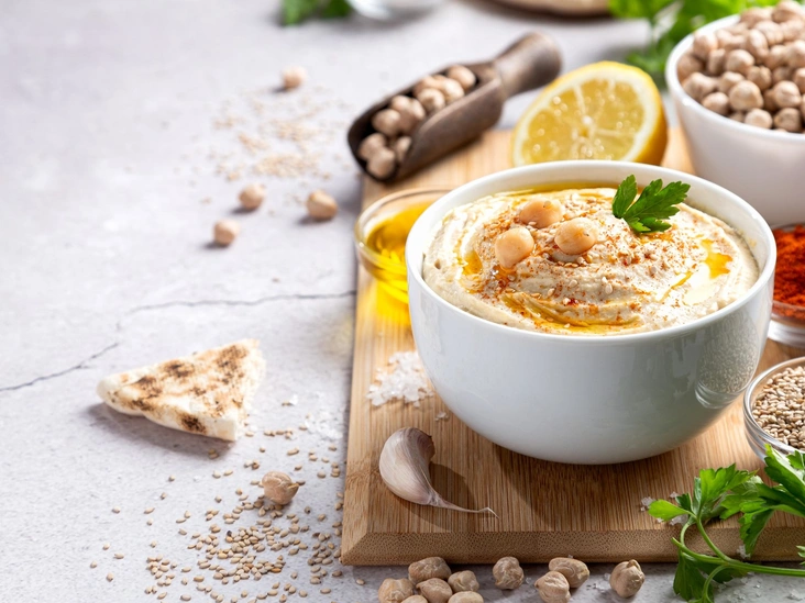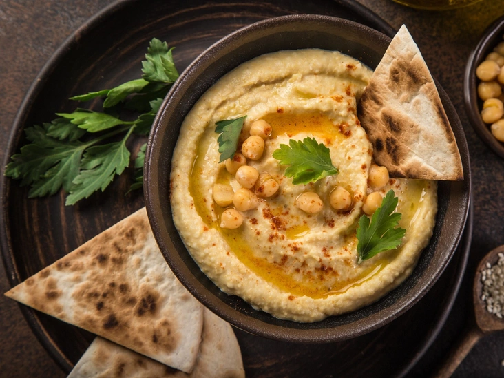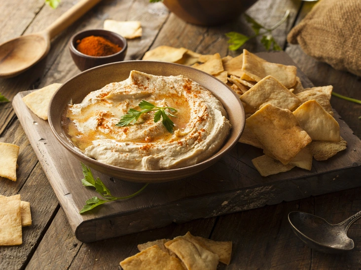 Хумус — это традиционная ближневосточная закуска из нута, кунжутной пасты, оливкового масла и специй. Это блюдо также популярно у приверженцев веганской диеты, ведь нут — отличный источник растительного белка. Хумус можно подавать как отдельную закуску с несладкой выпечкой или овощами или же с основными горячими блюдами, в качестве соуса.