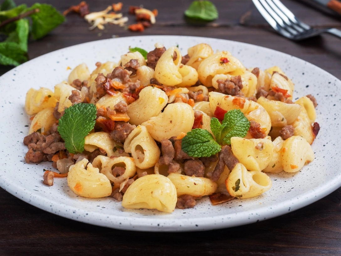 Выложите макароны к готовому фаршу и прогрейте вместе на небольшом огне около минуты. Подавайте блюдо в горячем виде.