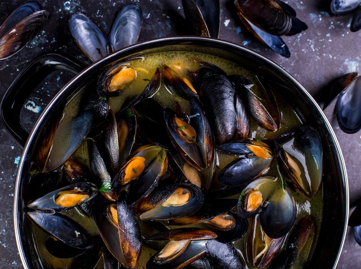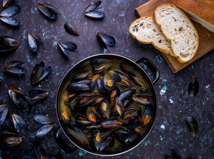 Отдельно обжарьте чиабатту. Посыпьте мидии рубленой петрушкой и полейте оливковым маслом. Подавайте к столу с гренками.