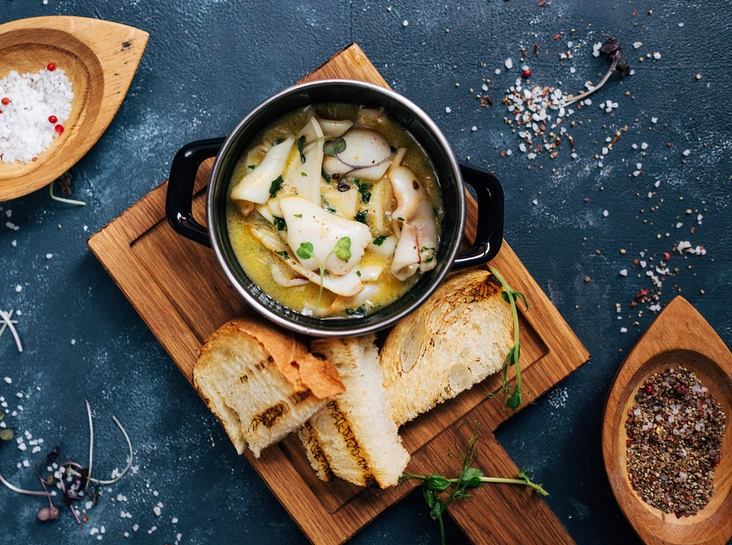 Влейте рыбный бульон и чуть-чуть выпарите. Затем добавьте сливочное масло и готовьте на медленном огне, постоянно помешивая, до образования соуса. Посолите, поперчите, приправьте рубленой зеленью. Подавайте к столу с гренками из чиабатты.