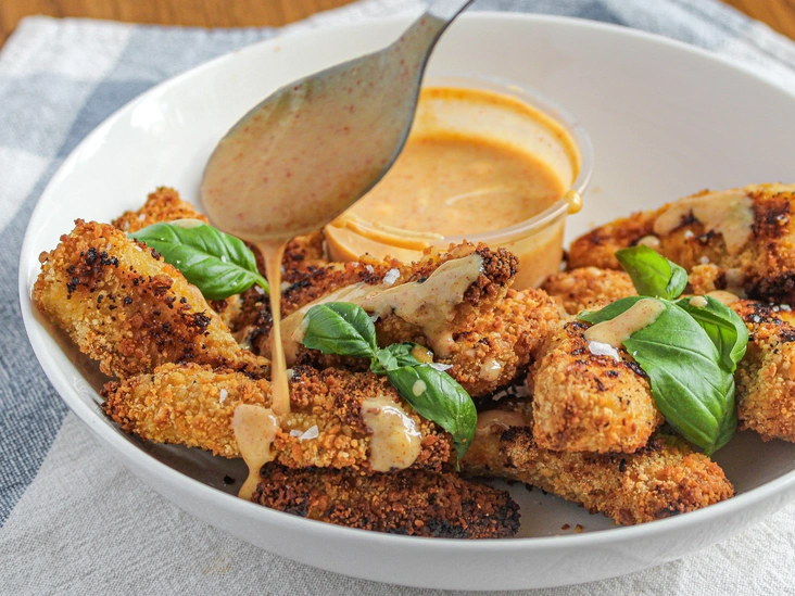 У этого рецепта очень хрустящая корочка, но она вполне вписывается в кето-диету. Для этого используется миндальная мука и хлопья из полбы, обволакивающие куриное мясо. Это не только помогает снизить содержание углеводов, но и придает пикантный поджаренный ореховый вкус. Если хотите сократить содержание калорий, исключите из рецепта айоли.