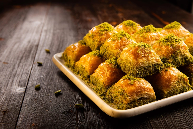 Липкая и сочная пахлава — это десерт, приготовленный из слоеного теста, орехов, специй, сахара и /или меда. Его подают по всему Ближнему Востоку, Турции и Греции. Этот десерт довольно прост в приготовлении: все, что вам нужно, это выкладывать листья теста друг на друга, смазывая их сливочным маслом, а в середину добавить начинку из орехов. Блюдо запекается в духовке около 40 минут, а позже к нему добавляют сироп из сахара и/или меда.