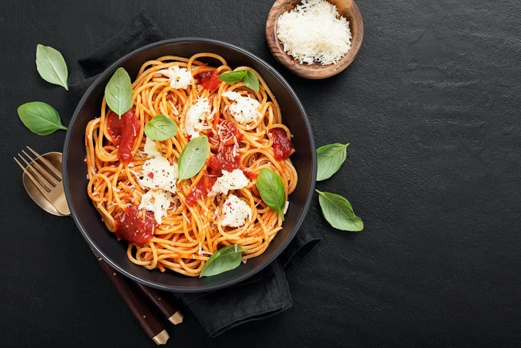 Важный ингредиент этого итальянского блюда — моцарелла без лактозы. Нежный сыр в сочетании с ароматным оливковым маслом, помидорами и перцем делает спагетти еще вкуснее.