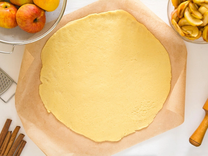 Разогрейте духовку до 175°C. Застелите две половинки противня пергаментом. Разложите на них ломтики яблок, расположив их в один слой. Запекайте яблоки около 45 минут, время от времени поворачивая противни. Дайте яблокам остыть, затем смешайте их с мукой и сахаром. Начинка готова. Теперь можно приступать к тесту.