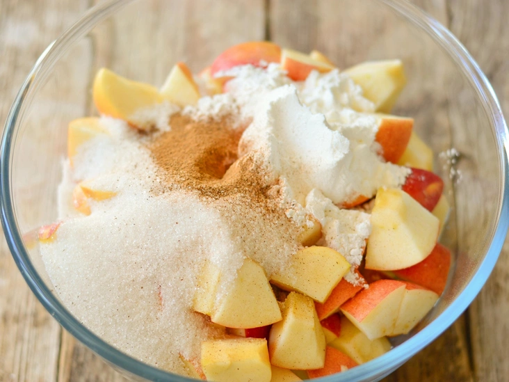 Пока тесто остывает, займитесь начинкой. В большой миске перемешайте очищенные и нарезанные яблоки, лимонный сок, немного муки, все специи, сахар и ванильный экстракт, пока они полностью не покроют яблоки. Отложите начинку в сторону, пока духовка разогревается — это время позволит яблокам начать выпускать сок.