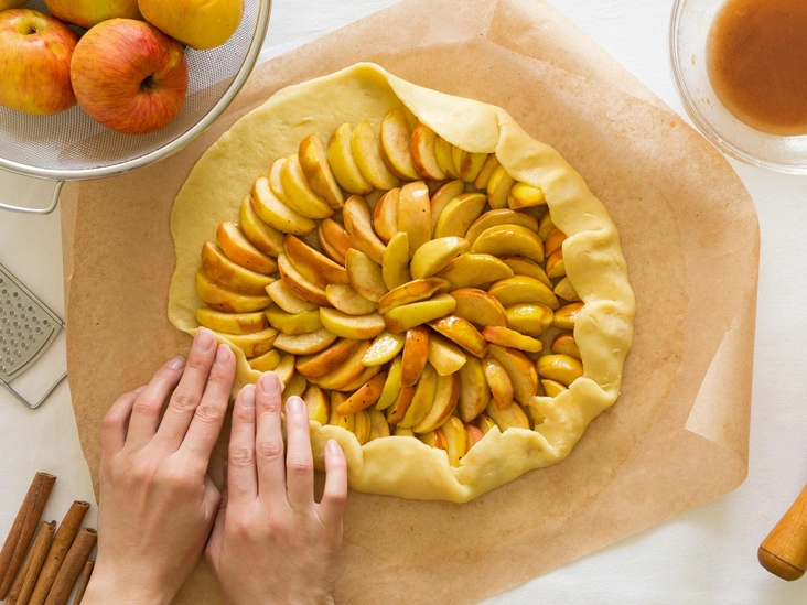 Выложите яблоки (без сока) в центр теста, оставляя свободными 5-7 сантиметров по краю (их нужно будет загнуть). Аккуратно сложите края теста поверх яблок, при необходимости перекрывая тесто. Аккуратно нажмите, чтобы запечатать края.