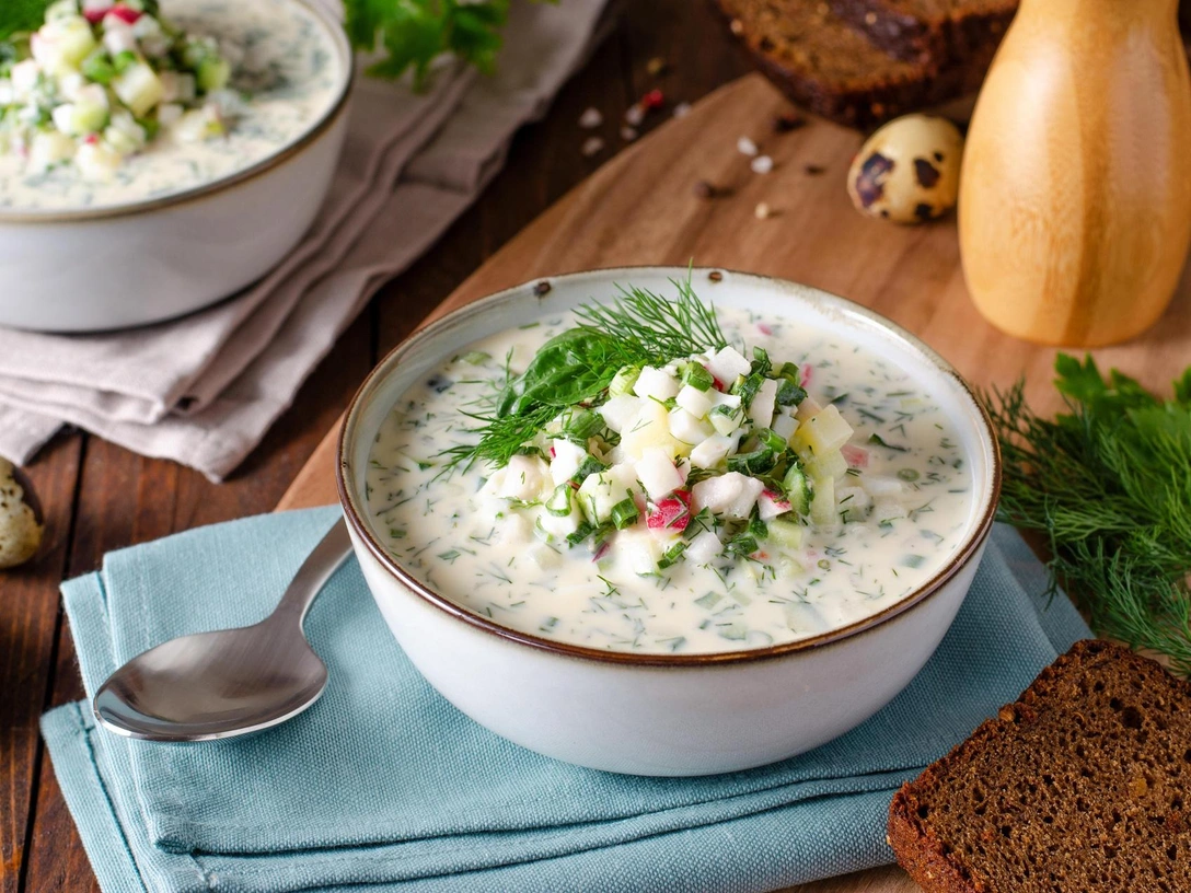 Окрошка — прекрасное сбалансированное блюдо, в котором есть и богатые витаминами и микроэлементами овощи, и животные белки (за счет пристутсвия яиц, колбасы или мяса).