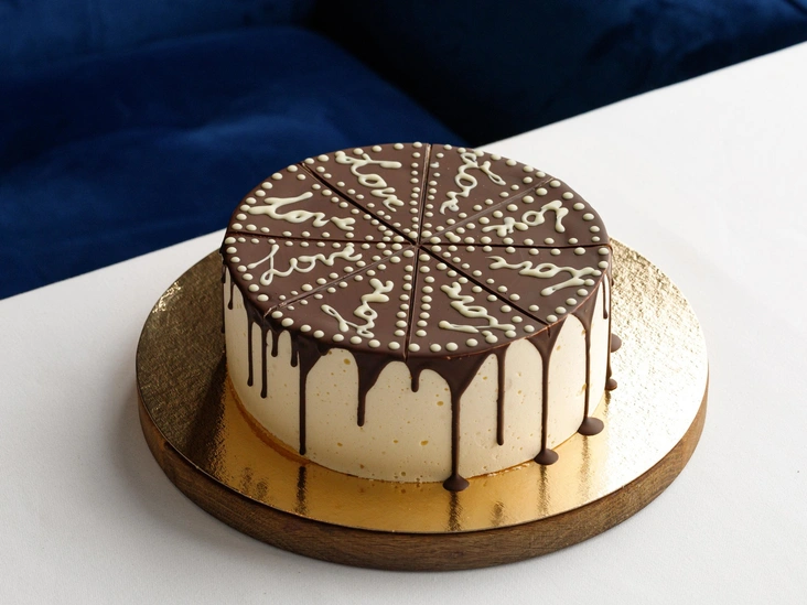 Затем темный шоколад смешать с какао маслом — какао масла должно быть меньше. Растопить на водяной бане и перемешать до однородности. Остывшую до комнатной температуры массу распределить поверх суфле и дать застыть. Можно также украсить торт надписью или рисунком, взяв для этого белый шоколад.