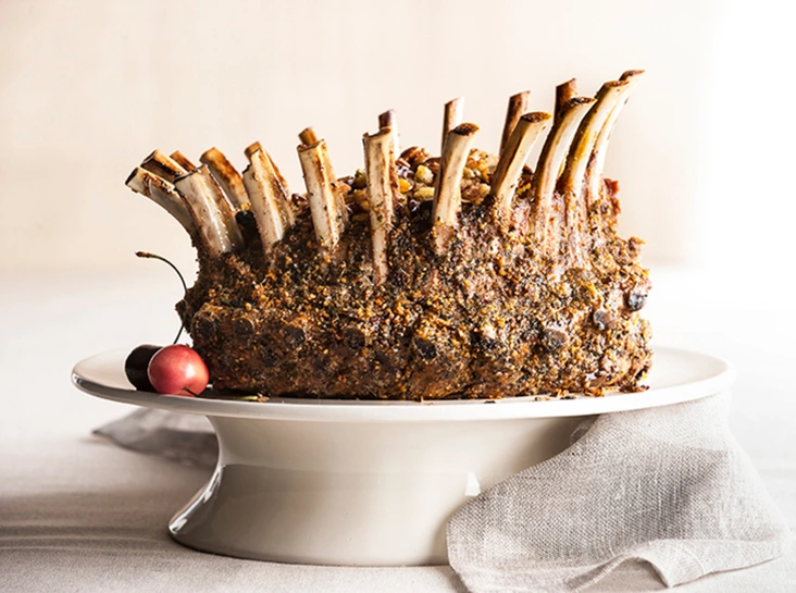 Как следует разогрейте духовку. Поместите на решетку гриля ребрышки, поставив их наклонно-вертикально (соорудите нечто вроде короны). Очистите чеснок и нашпигуйте им мясо. Посолите, поперчите, смажьте маслом и на 20 минут поставьте в духовку. Готовое мясо должно быть зажаренным снаружи и розовым — внутри. Подавать каре и есть его нужно очень горячим.