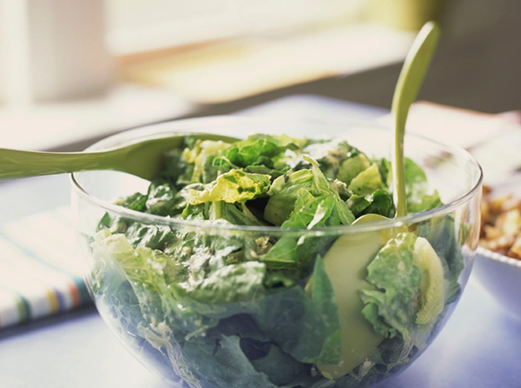 Порвите салат руками и заправьте его уксусом (можно также взять любой соус по желанию). Белки мелко нарежьте и смешайте с салатными листьями. Подсолите салат и посыпьте сверху тертыми желтками.